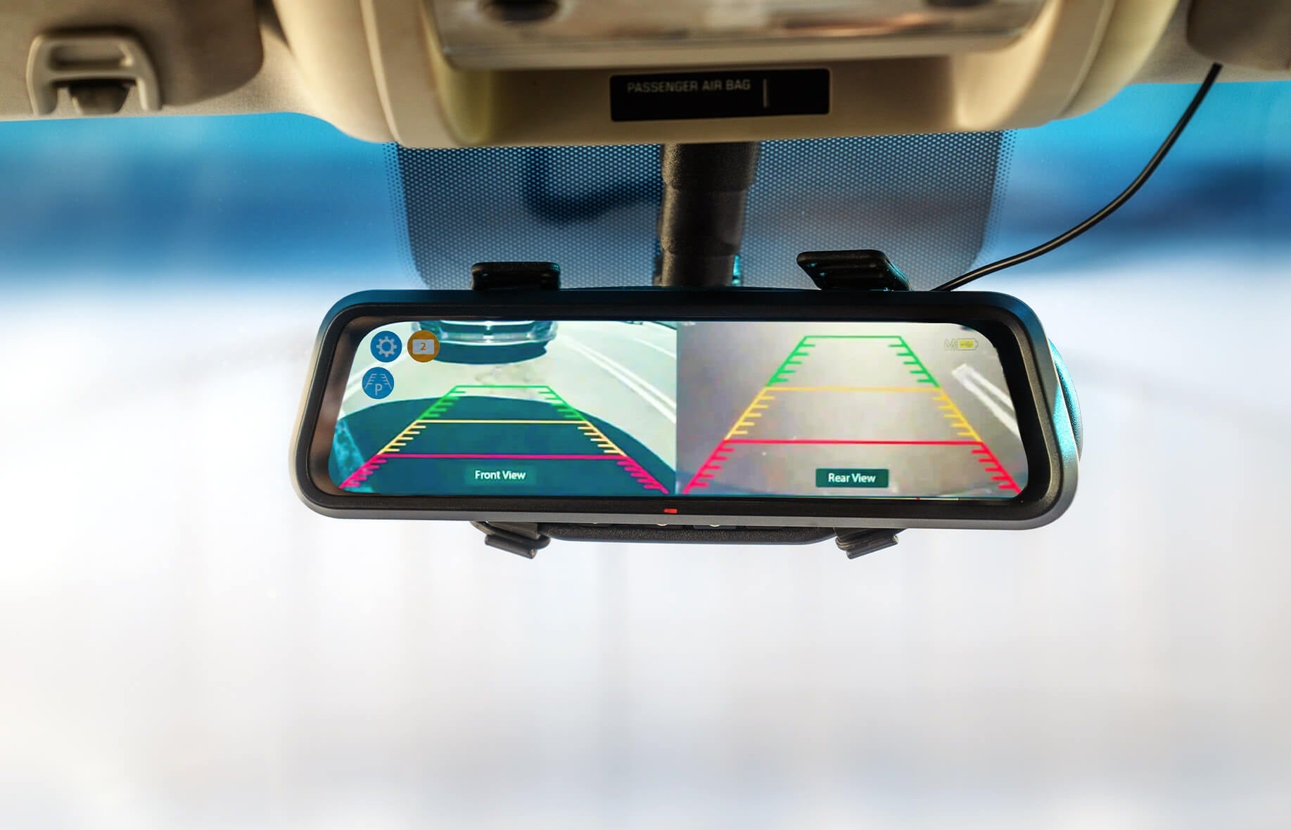 Add an extra TYPE S camera to the front of your vehicle and pair it with the mirror backup cam; be extra cautious, see not only what’s behind your car but also what’s in the front. The rearview mirror monitor will display both camera views side-by-side in split-screen mode so you can see everything clearly all at once.