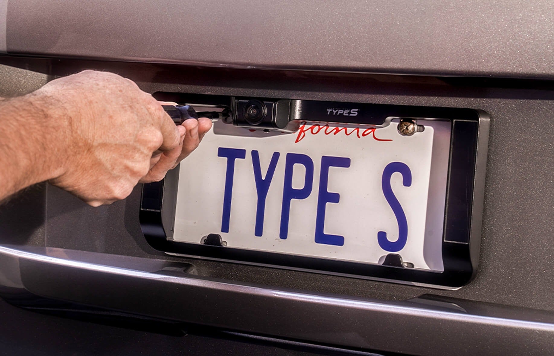 TYPE S Solar Powered Portable License Plate Frame Backup Camera with HD monitor built into rear-view mirror. Smart Wireless Button Control