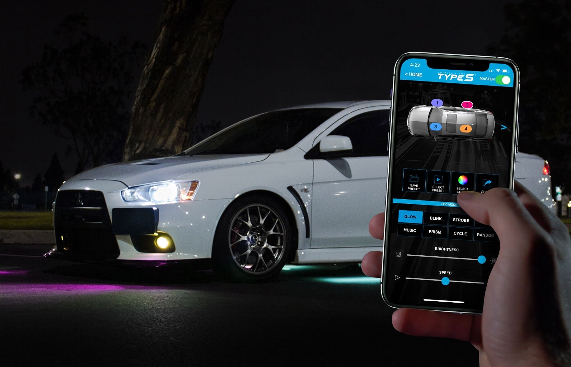 Easily control your lighting experience with the TYPE S LED app, featuring 49 unique colors, 8 light modes, and multi-zone presets for the ultimate exterior look.