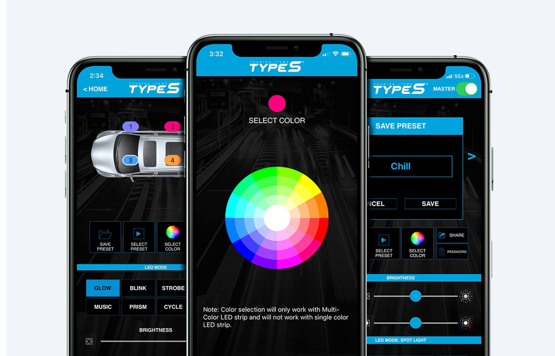 Easily control your lighting experience with the TYPE S LED app, featuring 49 unique colors, 8 light modes, and multi-zone presets for the ultimate interior look (TYPE S smart hub required).